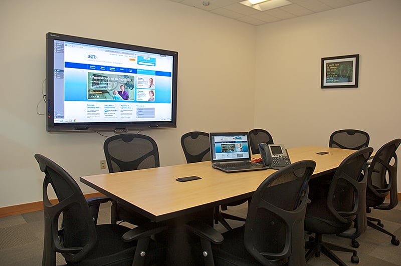 Engaged primarily by the ASRT’s Information Services Department, this team room’s principal feature is a 72-inch “smart board” used for real-time IT programming and design, web conferencing and meetings with external vendors. This mid-sized conference room seats 10 and has a west-facing city view.