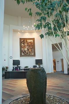glass, with artwork, large tapestries and a stone water feature.